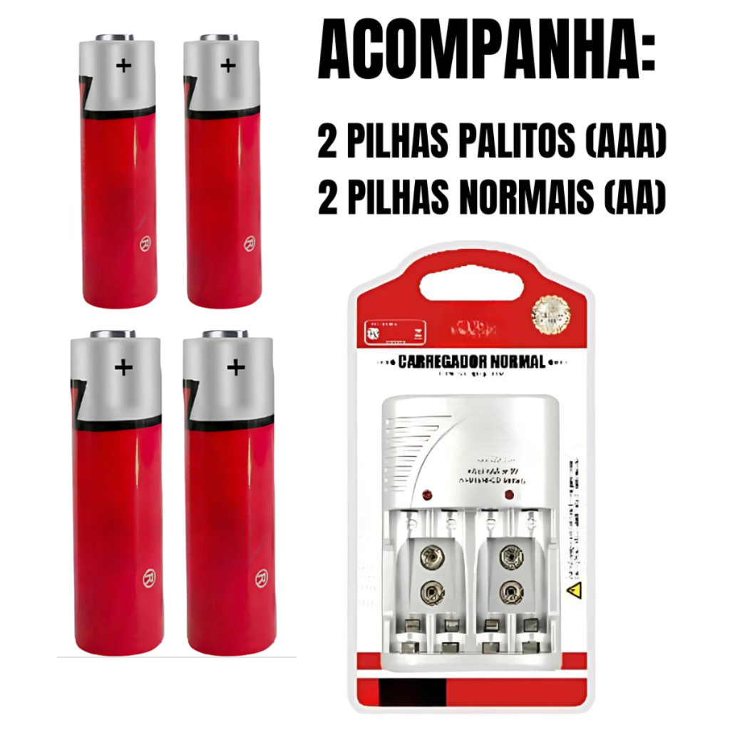 - Compatibilidade: suporta pilhas AA e AAA de qualquer marca, com capacidade máxima de 2500mAh (AA) e 1000mAh (AAA).
